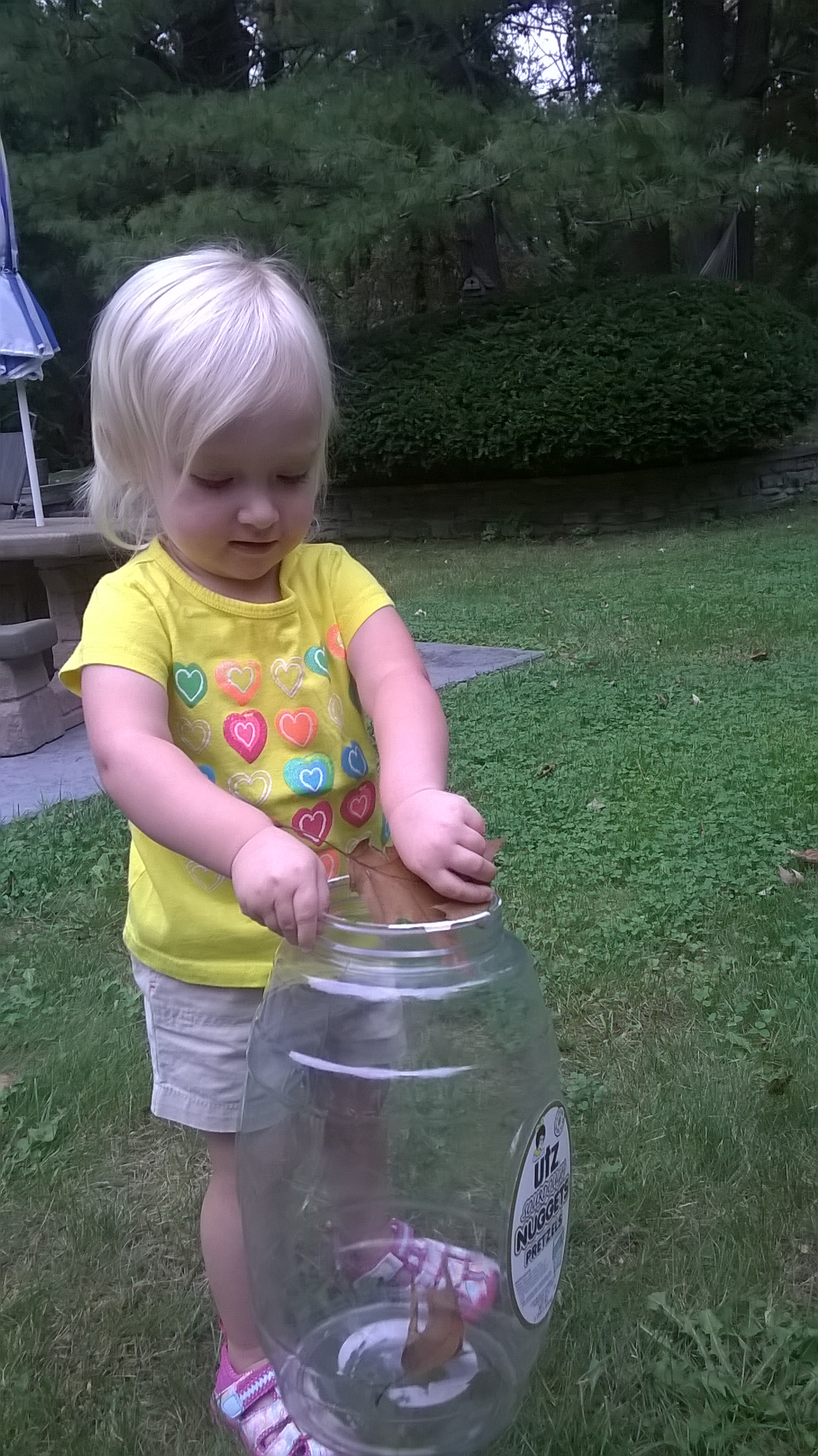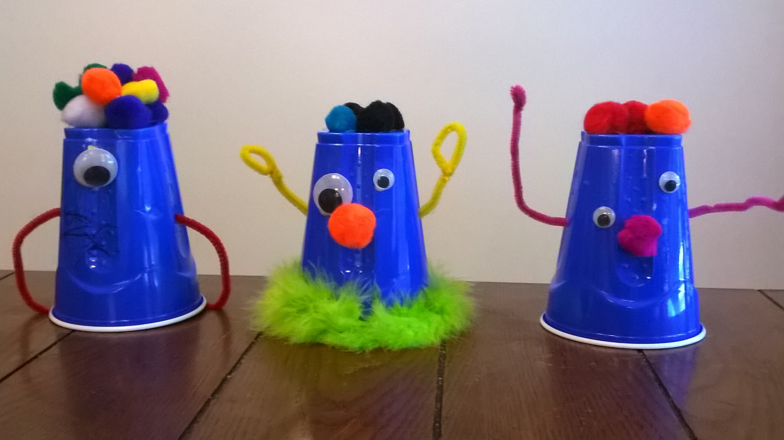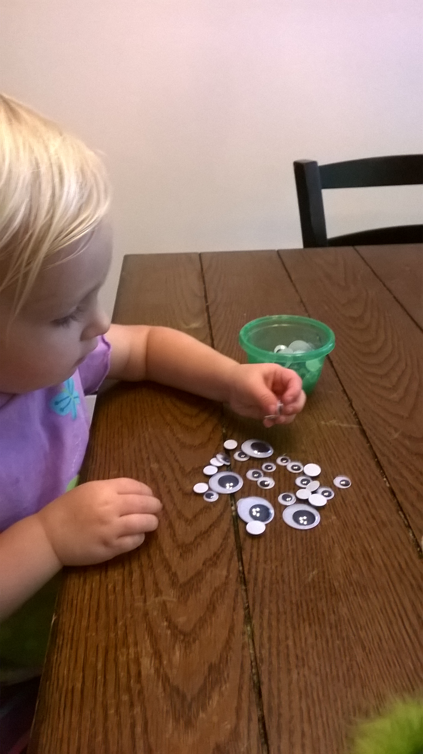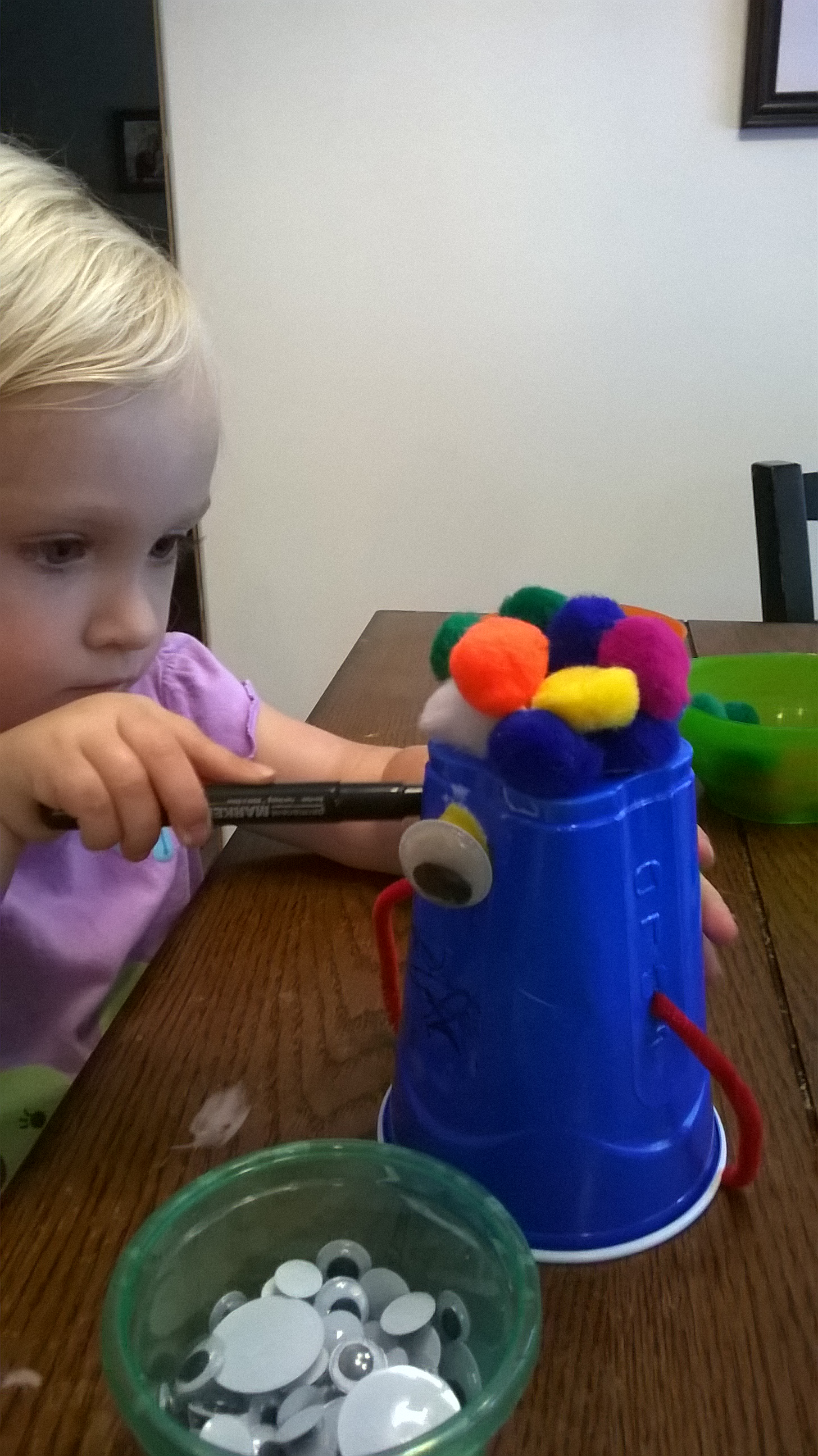 I originally bought a package of Solo Cups for something different to build with and it turned out to be a great activity. Since them I have used them for many different activities. Solo cup robots or aliens made a great addition to our Halloween decorations. When doing art projects like this I always make an example that is not to elaborate. This give Babs an idea of what we are working on. Not making it to elaborate leaves room for her imagination to be included. I poked a hole in the letter O on each side of the cup. An adult can do this with a knife or you can help your child do it with a single hole punch. Then they are able to thread the pipe cleaners through the cup for the arms. We used colored pom poms for the hair and nose and different size eyes. Regular Elmer’s School Glue worked perfect to get everything to stick.