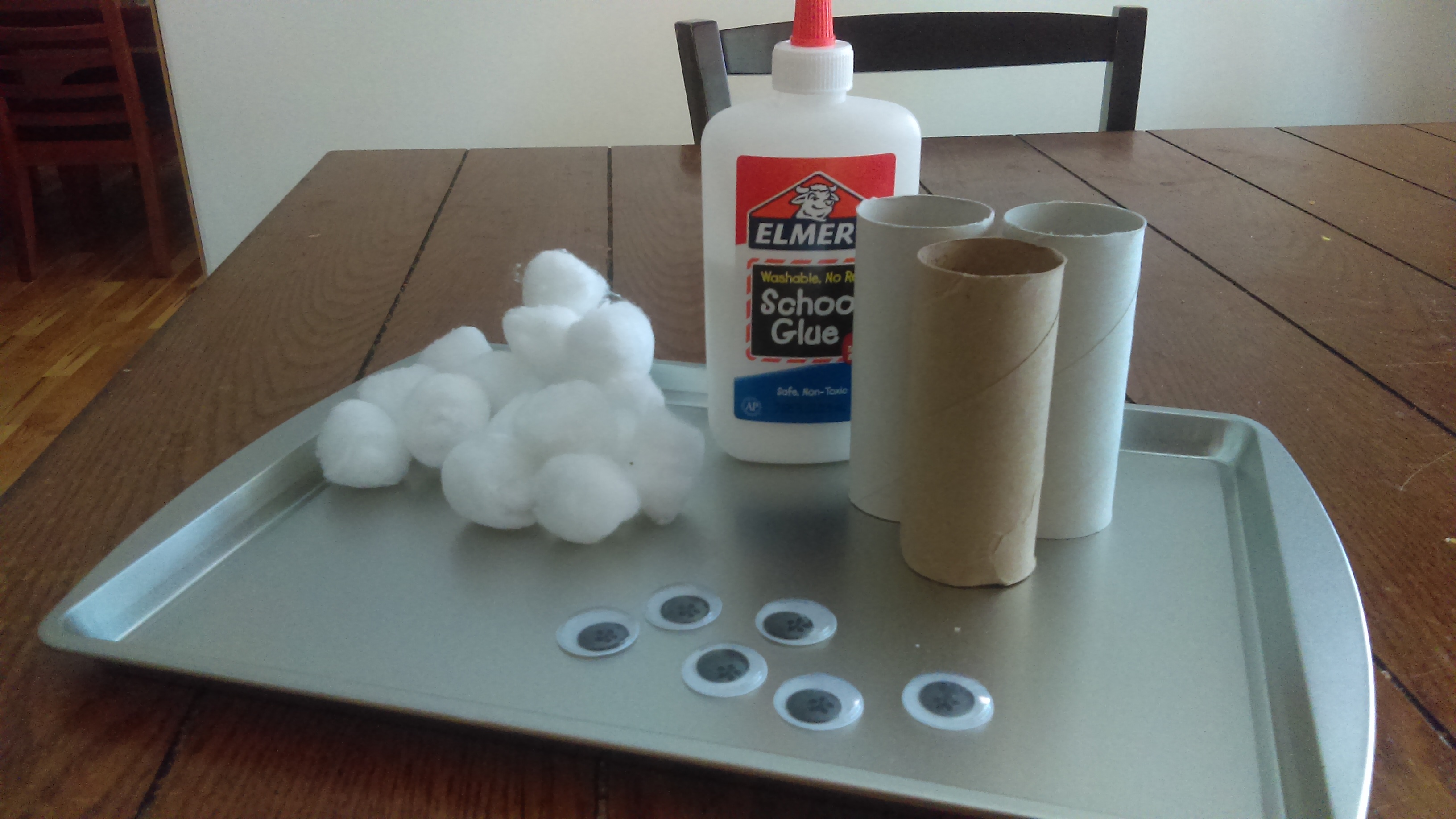 After unraveling all of the cotton balls, have the kiddos squeeze some glue onto the cookie sheet. They should then take the toilet paper tube and roll it the glue until the surface is covered. Last the can take the long strands of cotton balls and wrap them around the tube. Add the eyes and you are finished!