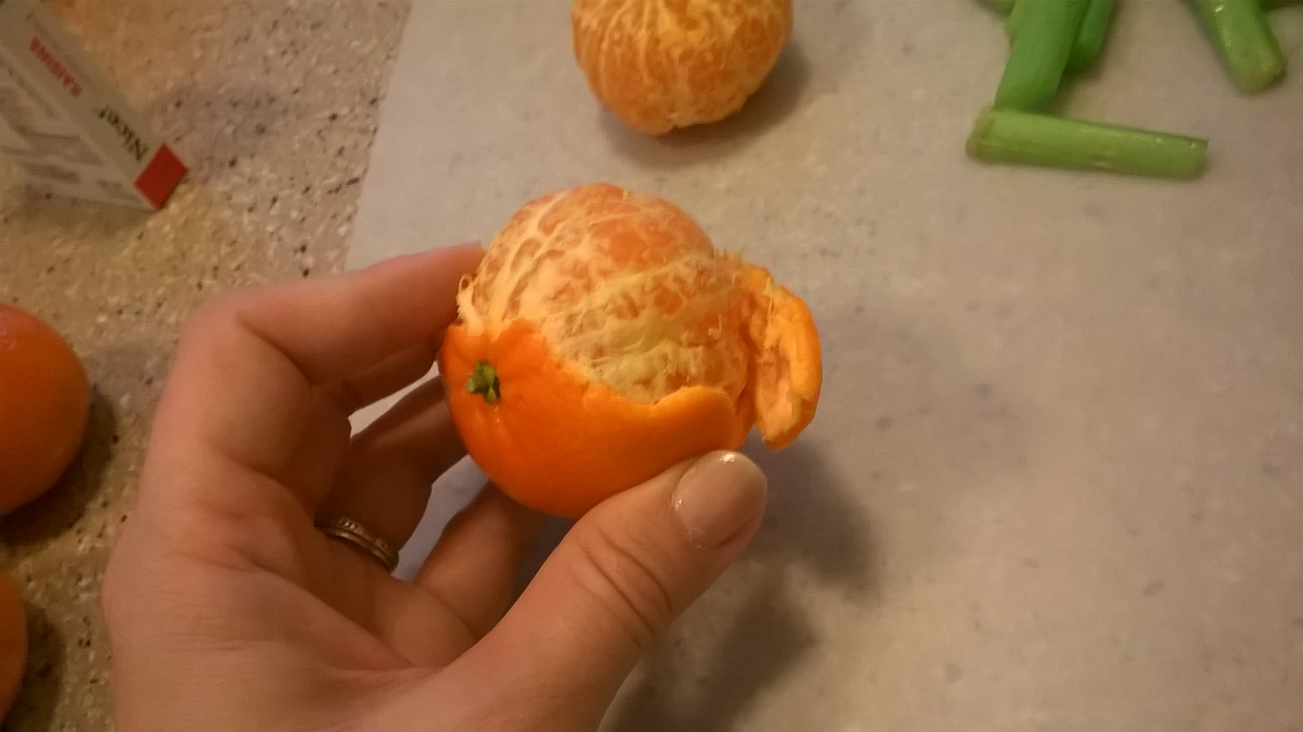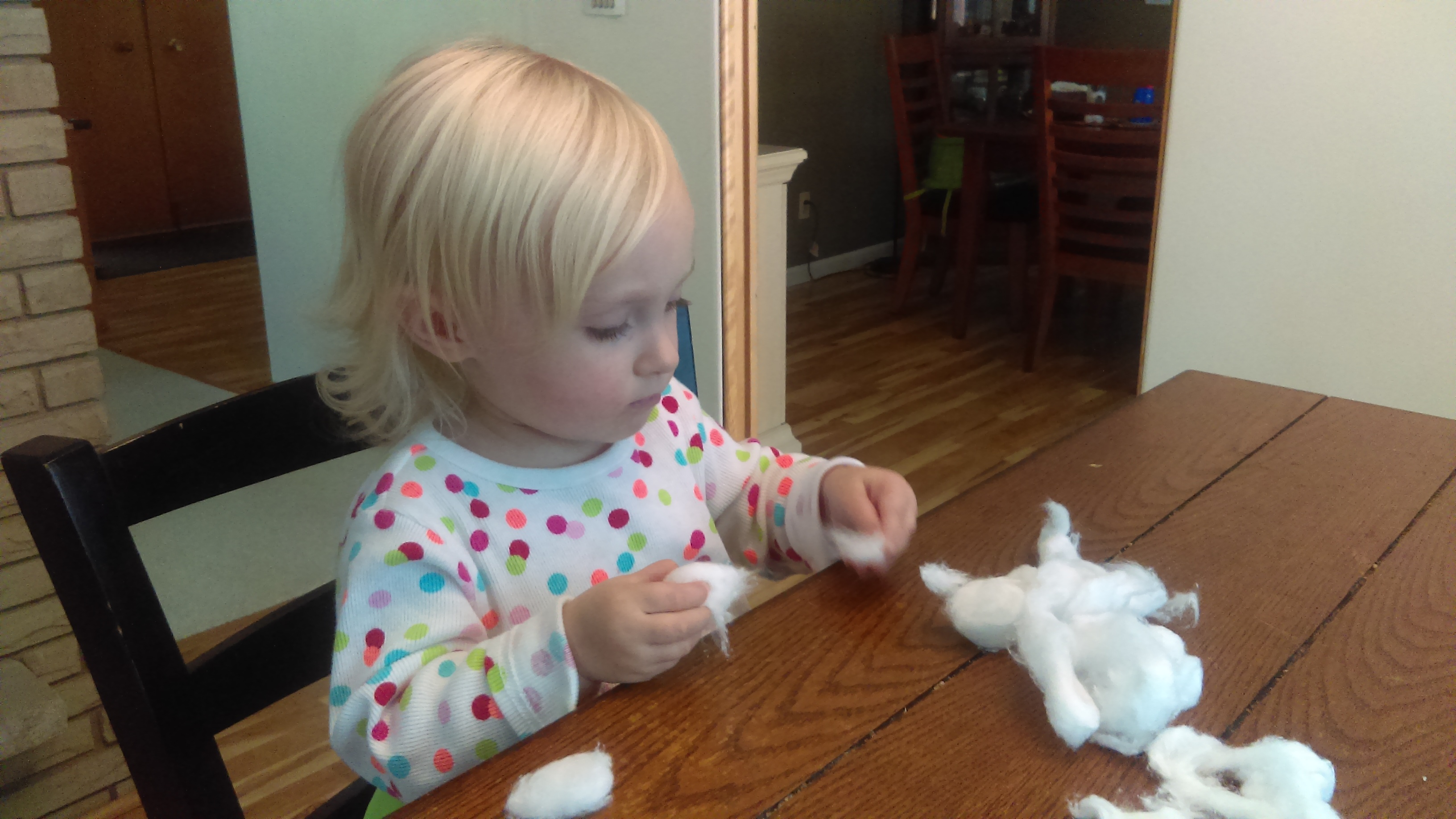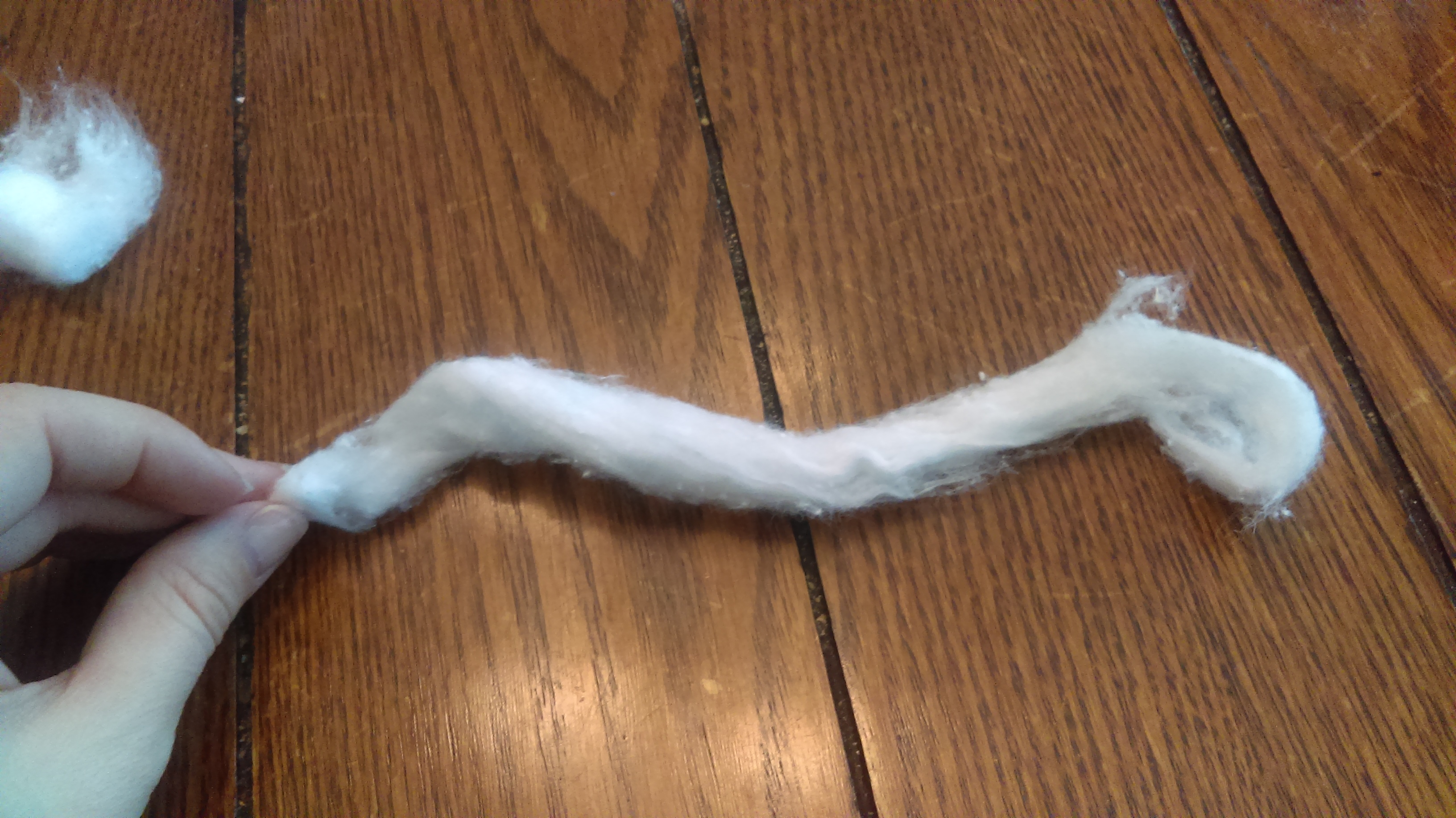 The next step is important if you really want it to look like a mummy. Babs needed help with this one. You need to unravel each cotton ball. I do this by pinching the side and then having Babs pinch the middle of