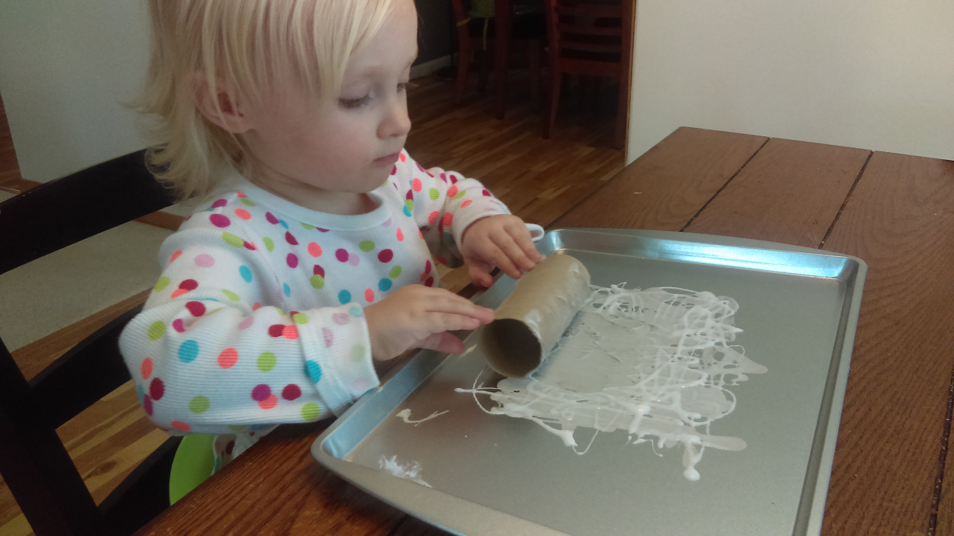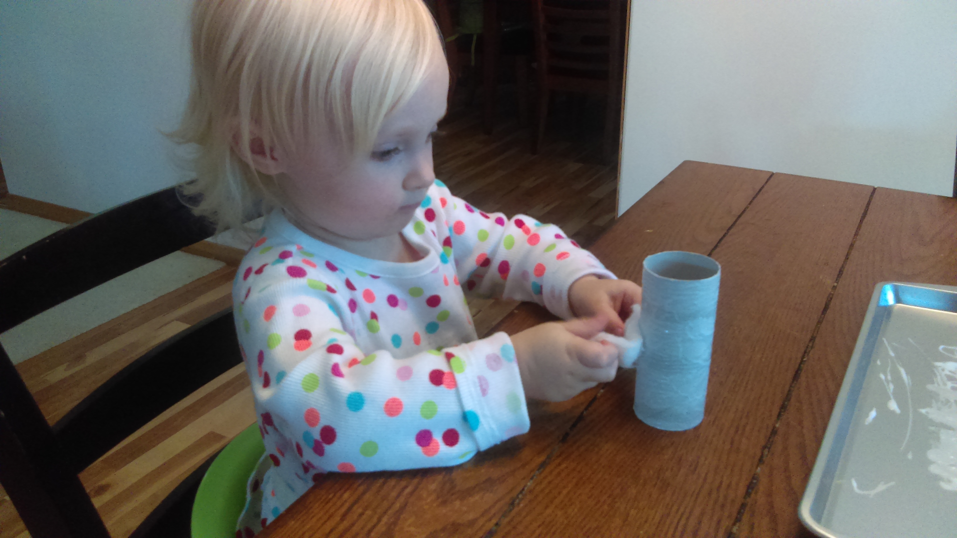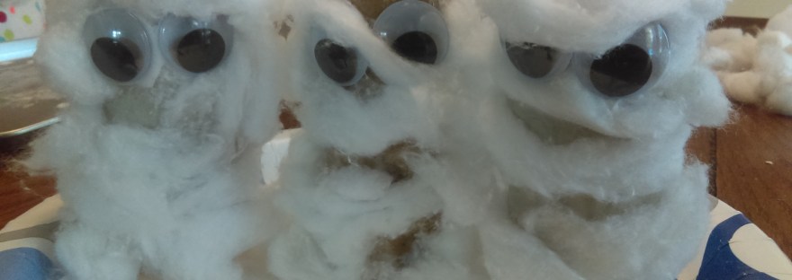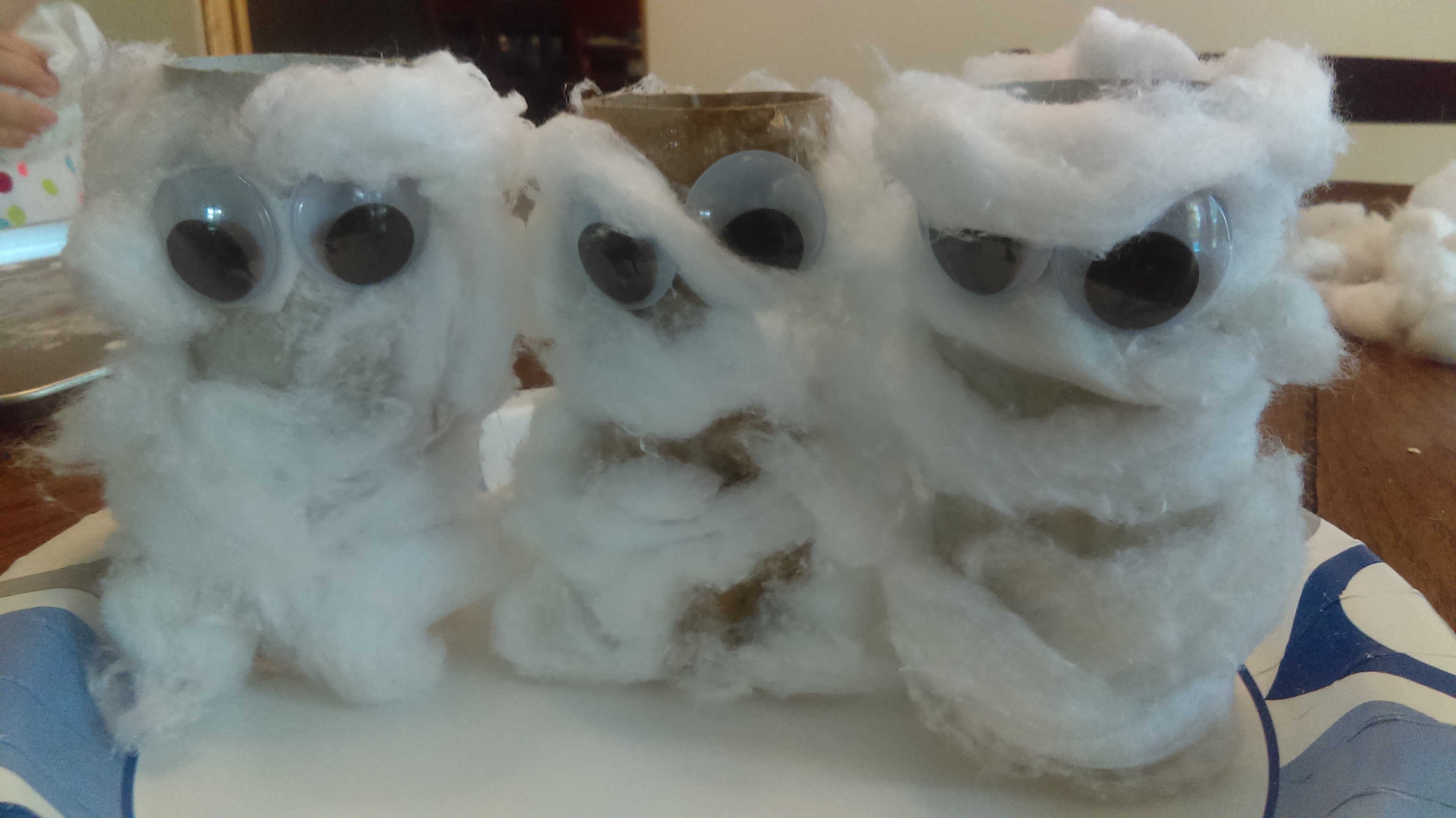 ne motor skills it takes to squeeze the glue, the sensory experience of glue and cotton ball fuzz stuck to your fingers, etc. So don’t be to upset if they don’t turn out perfect. Plus mummies are supposed to look like they are falling apart anyway! The only items you will need for this project are cotton balls, googly eyes, toilet paper tubes, a cookie sheet (or as we call it our art tray), and glue.
