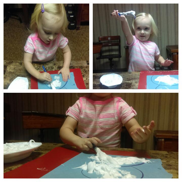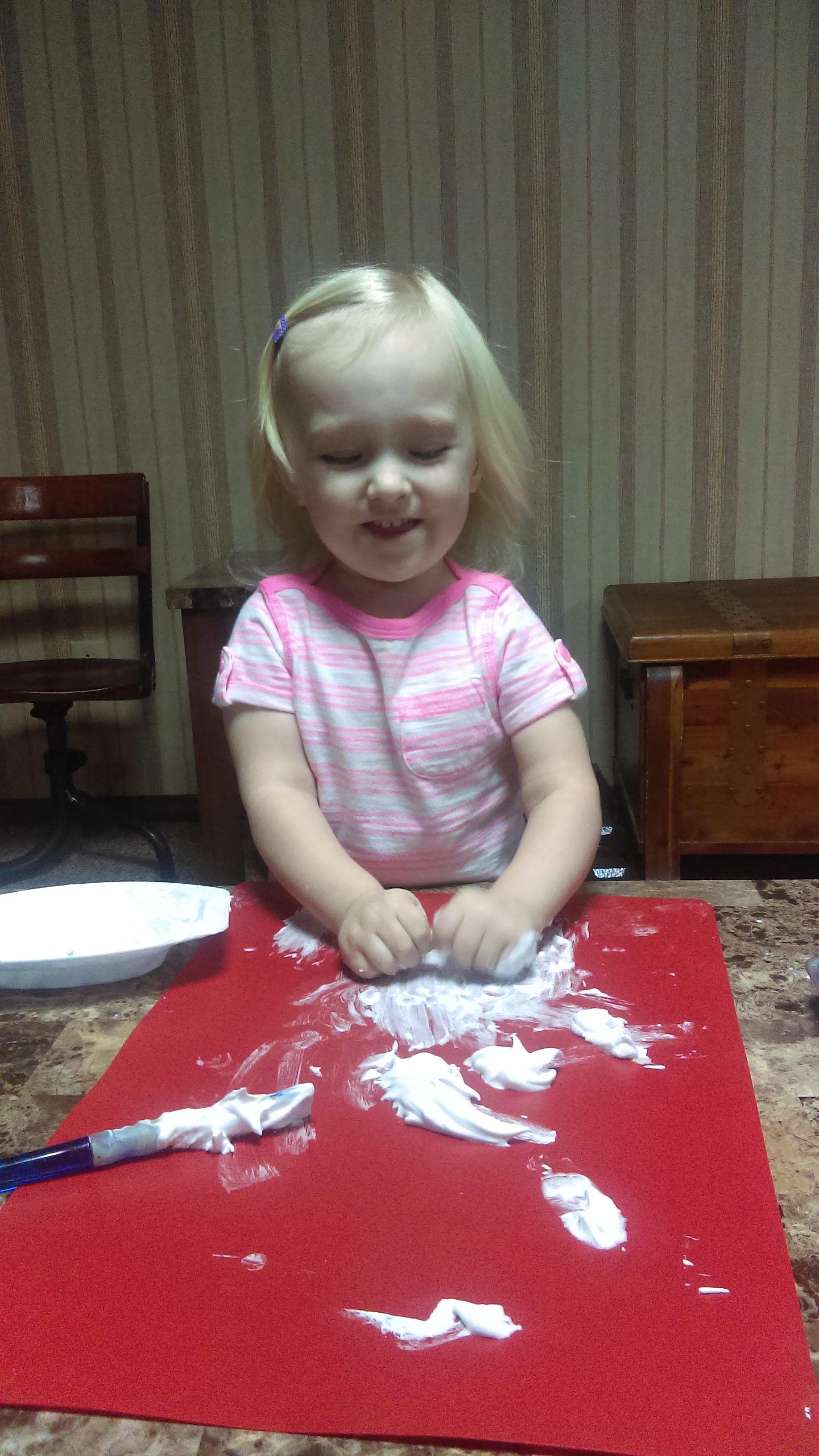 Puffy paint makes for a great new painting texture for kids. It’s also extremely easy to make. All you needed glue and shaving cream. During our art projects we have been working on following directions to make more purposeful pictures. So for this project we drew a snowman outline so Babs could work in staying inside the lines.