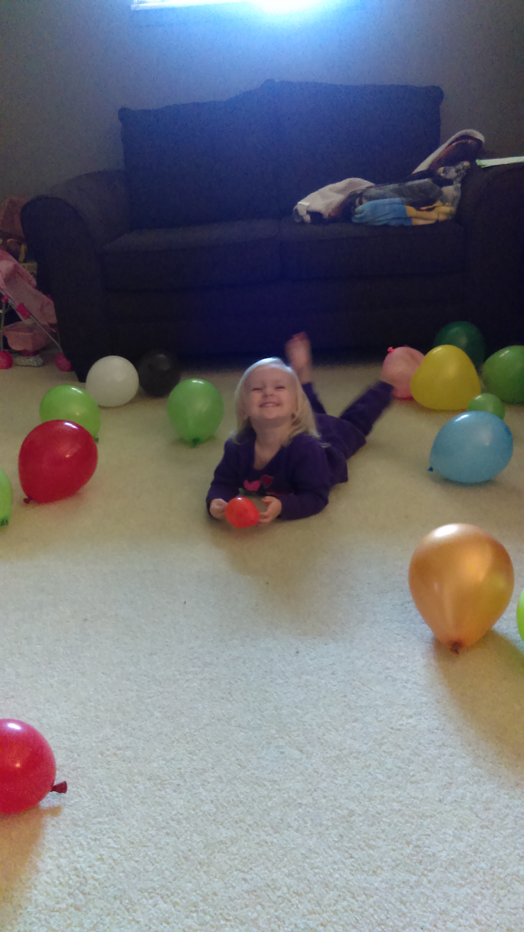 Babs loves playing with ribbon dancers in gymnastics so we decided to make one at home! The materials you are going to need include a hair tie of some kind and ribbon. We have tons of ribbon in our gift wrapping box. The scrunchie I used came with Babs leotard. I figured since her hair is STILL not thick enough to use it we could use it for this. Cut ribbon to the length you want. Ours are about two and a half feet long. Tie the ribbon to your hair tie. The more ribbon strands the better! Turn on some music and away they will go!