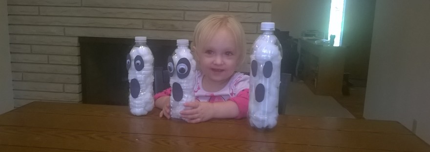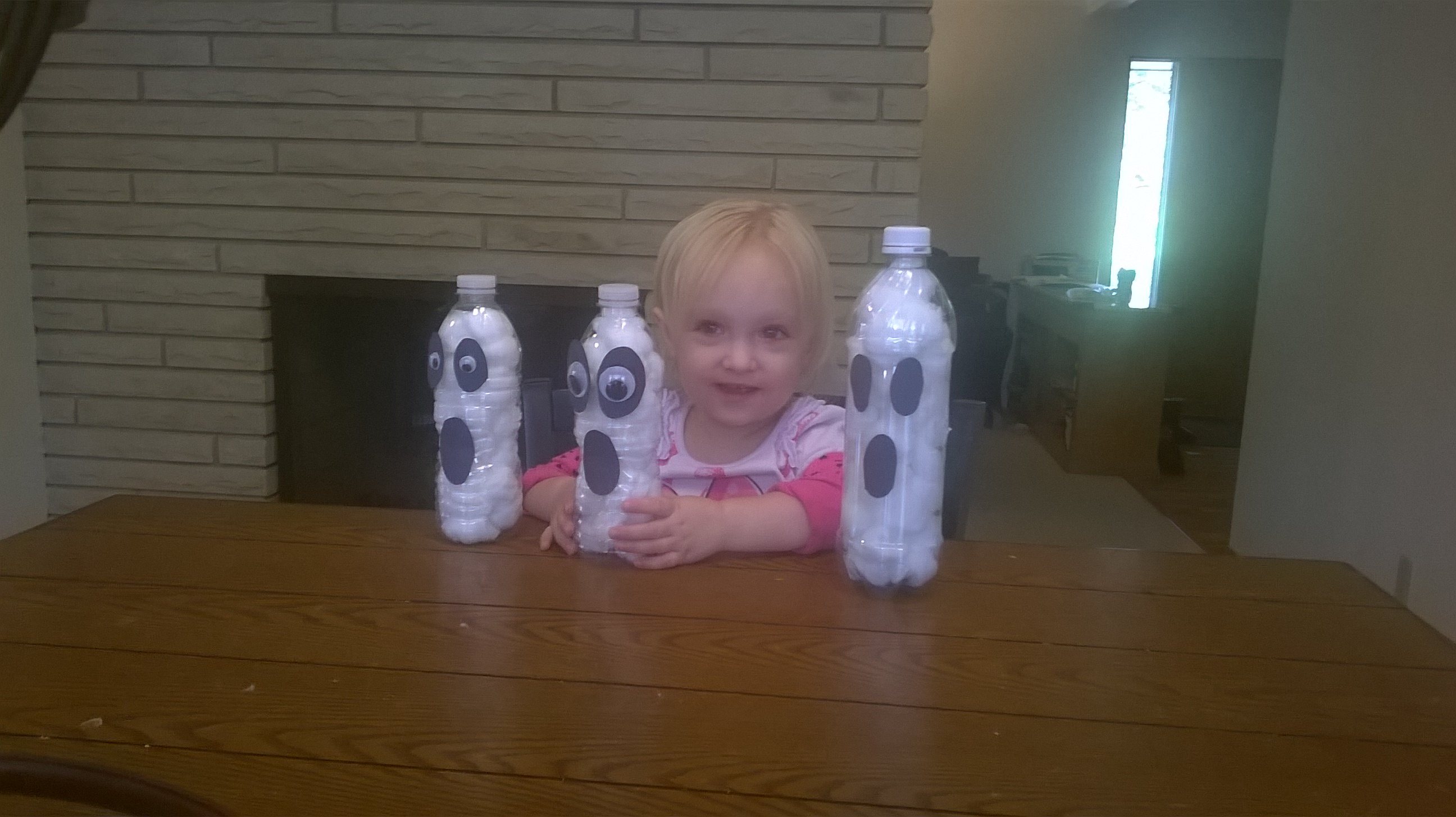 We did have to collect a few new leaves so we could have some different colors in there. Our previously collected leaves had already turned brown. I first made an example so she could see what we were going to make. I also kept the book close by so she could look at the picture. The example is pictured to the right. After that we worked on one together. During this time I encourage her to be as independent as possible. After we have made one together, I give her the materials to make one on her own. I give her some verbal prompts like, “remember where the arms go.” and I may help her squeeze the glue if she needs it. The one we did together and the one she did on her own are pictured below. I will let you guess which one she did on her own (hint: it still has a floating arm 🙂 )